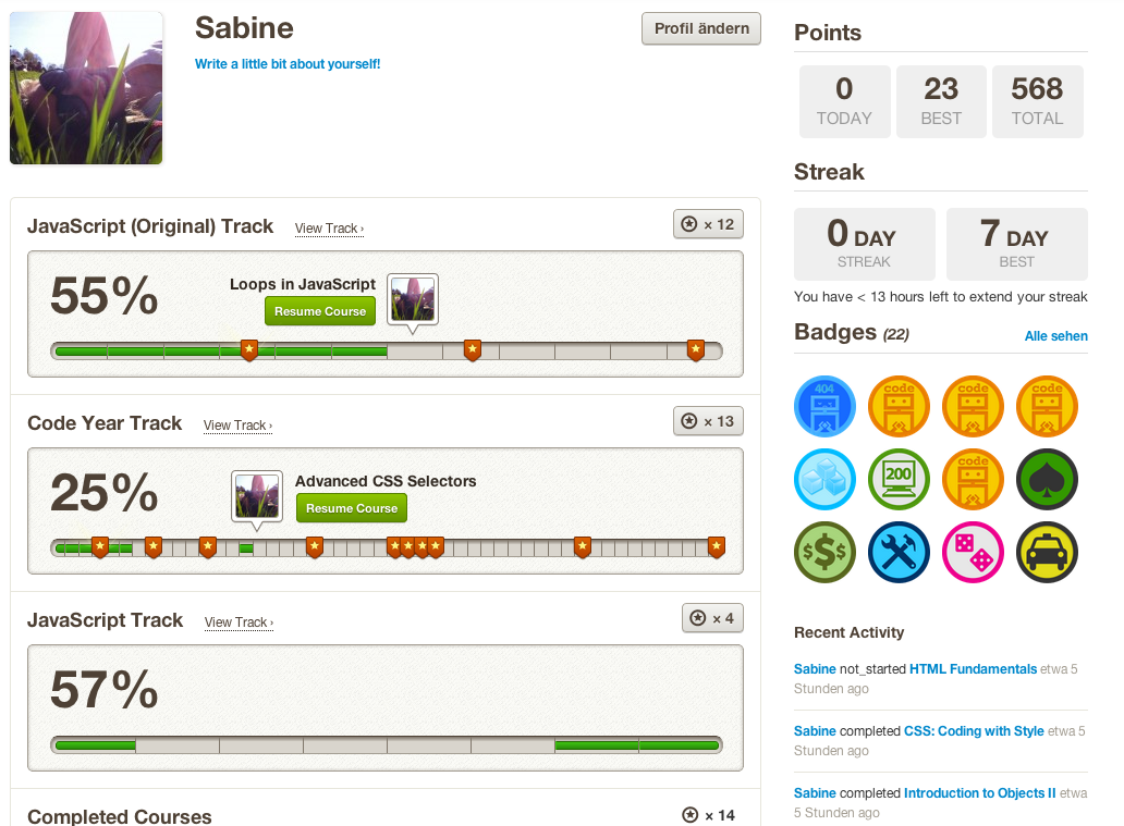 (ich bin übrigens noch weiter, aber leider ging Codecademy letzte Woche in die Knie und ich hab meine Lektionen aus der Woche verloren. Dafür gibt mir Codecademy aber ein spezielles Badge :-). Nur ein kleiner Trost, aber ich hab so wenigstens eine kleine Wiederholung)